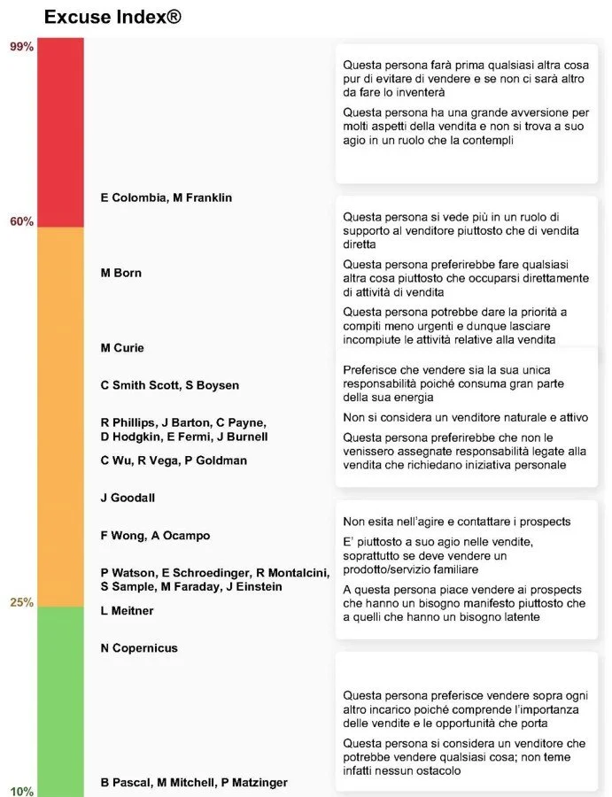 L’Excuse Index® misura con precisione la probabilità che un candidato o un venditore tenda a trovare scuse invece di vendere. Comprendi i processi, elimina le giustificazioni e costruisci una forza vendita orientata alla chiusura.